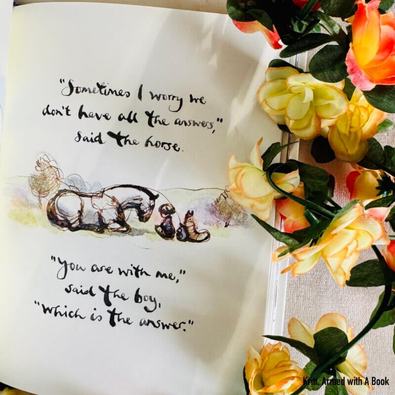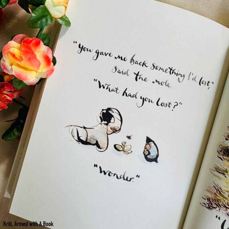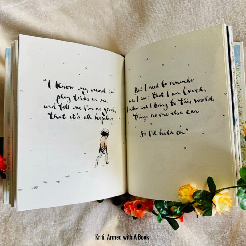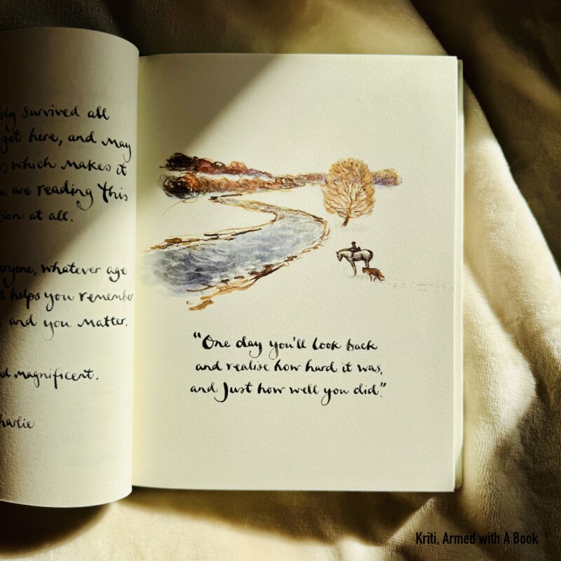 Like before, the story is about friendship, but this time it goes deeper. It is about storms that terrify us and the love and courage we have to find within us to keep going. The writing and illustrations go so well together — Charlie Mackesy has a talent for depicting awe through colour, the unknown through a crowded wall of trees, gentleness through smudging, and much more. Each picture is beautiful and speaks volumes.
